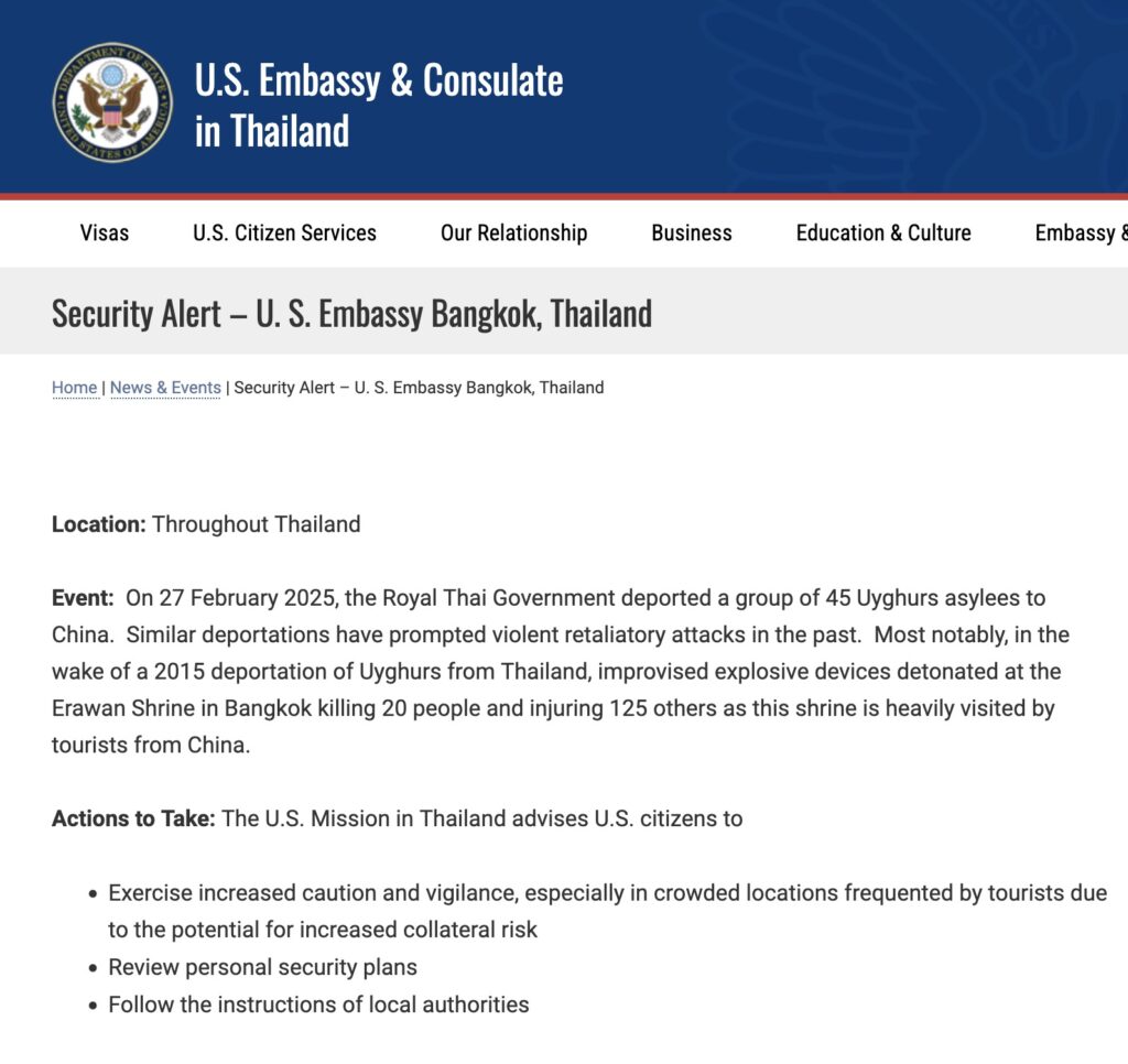 The United States and Japanese embassies in Thailand issued travel advisories about “terrorism fears” following the deportation of Chinese Uyghurs. The Thai Hotels Association last week sent out a circular to all members to survey the impact of this.