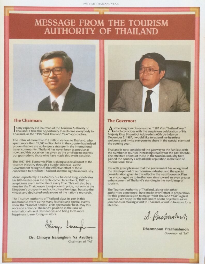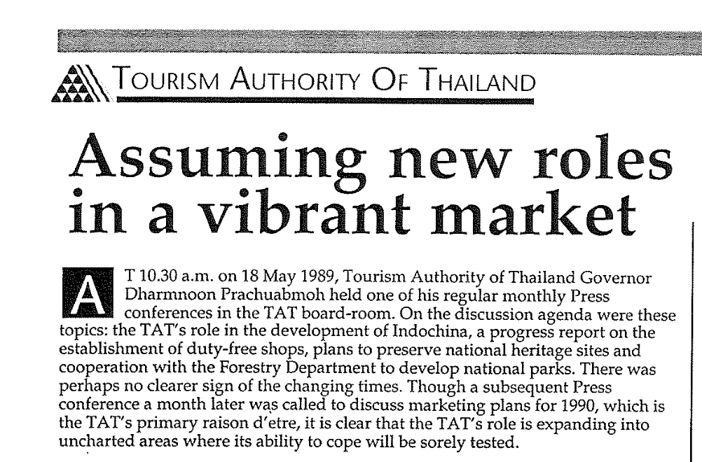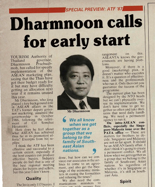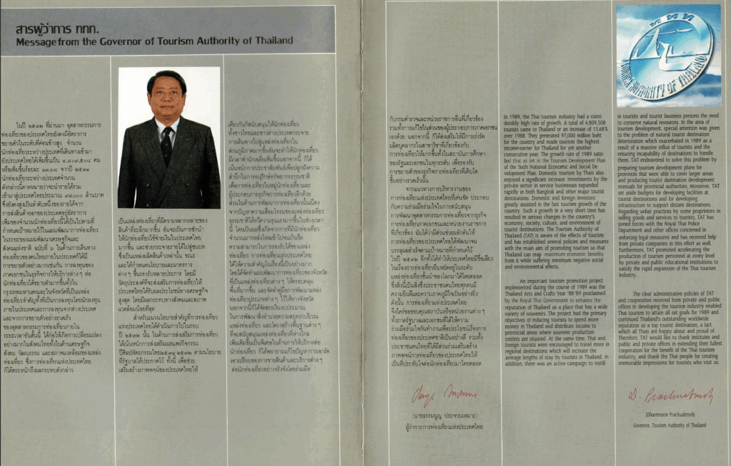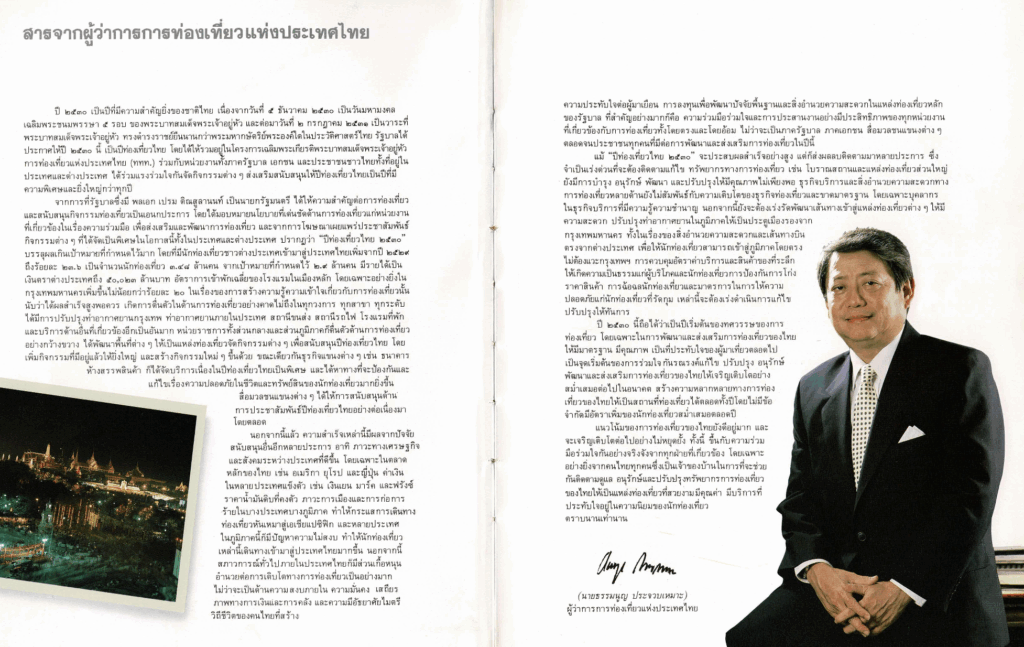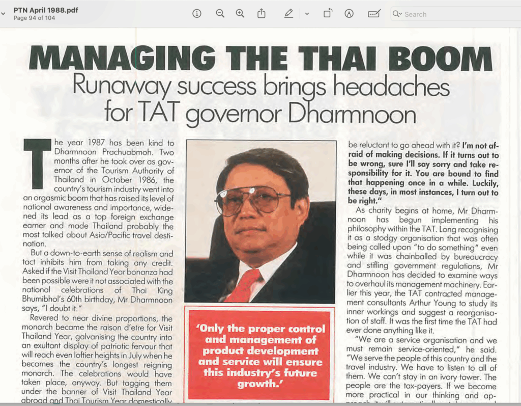 As the third head of the TAT since its formation in 1960, the Australian-educated Governor presided over the runaway success of 1987 Visit Thailand Year but also had to deal with its subsequent management failures as well as the May 1992 political riots, one of the bloodiest confrontations in Thai history.