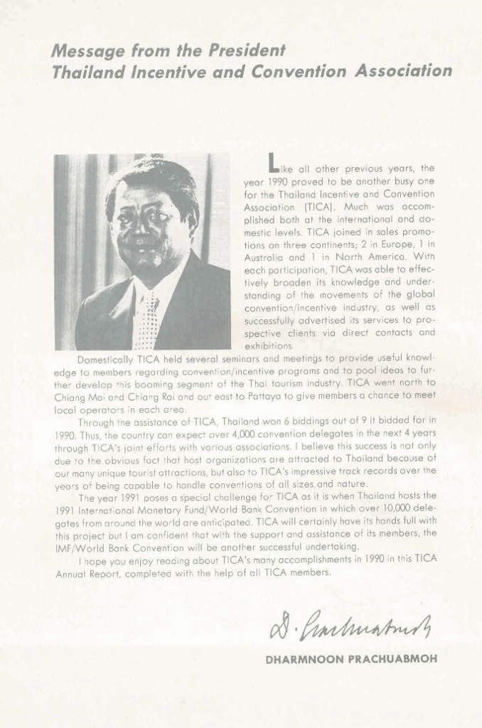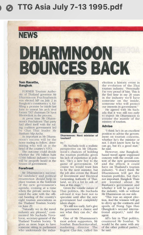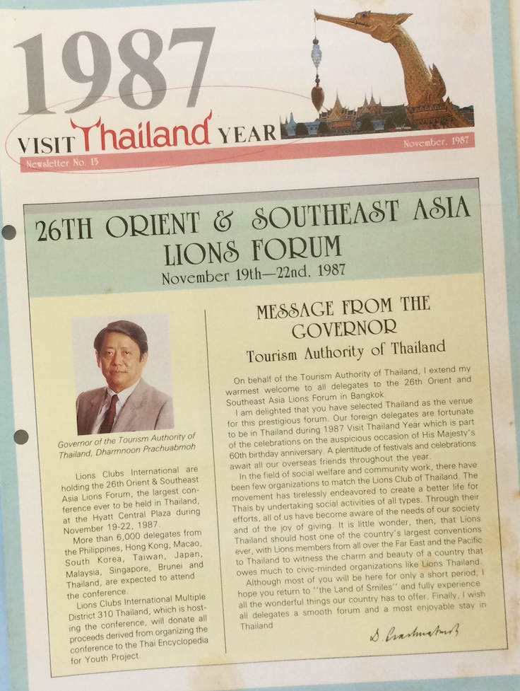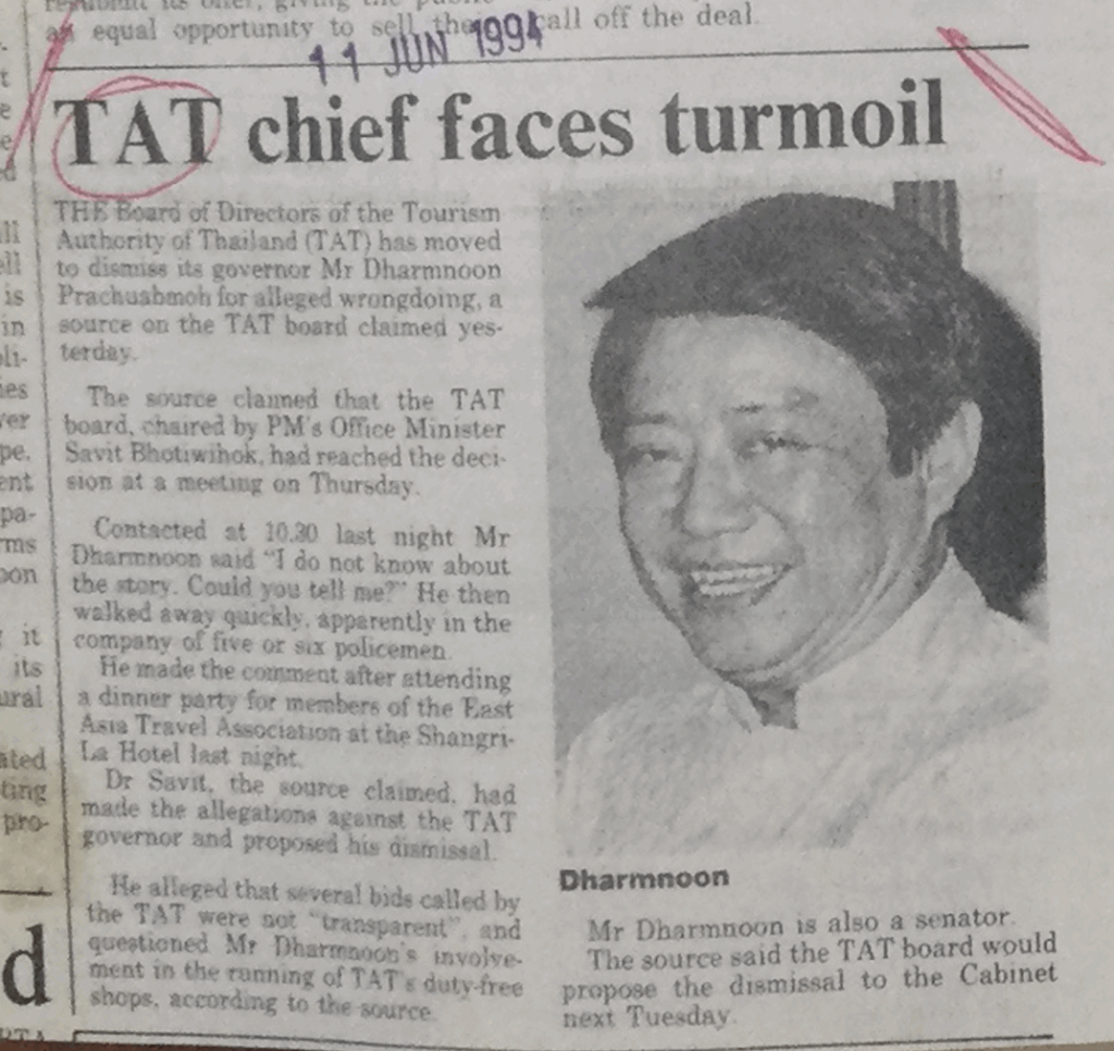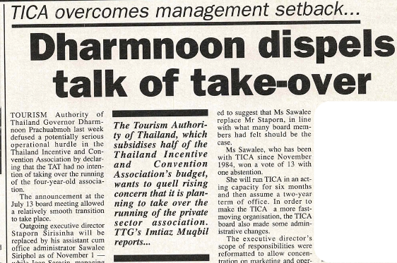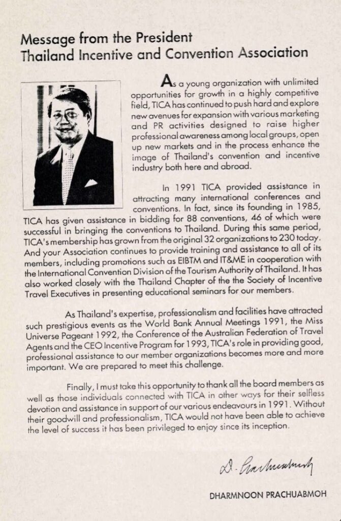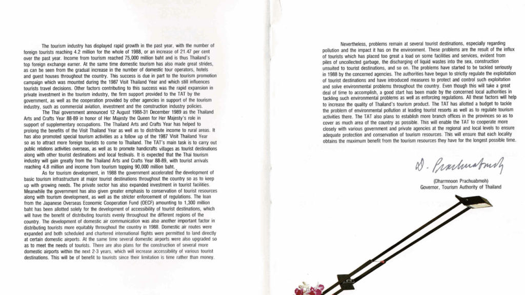 As the third head of the TAT since its formation in 1960, the Australian-educated Governor presided over the runaway success of 1987 Visit Thailand Year but also had to deal with its subsequent management failures as well as the May 1992 political riots, one of the bloodiest confrontations in Thai history.
