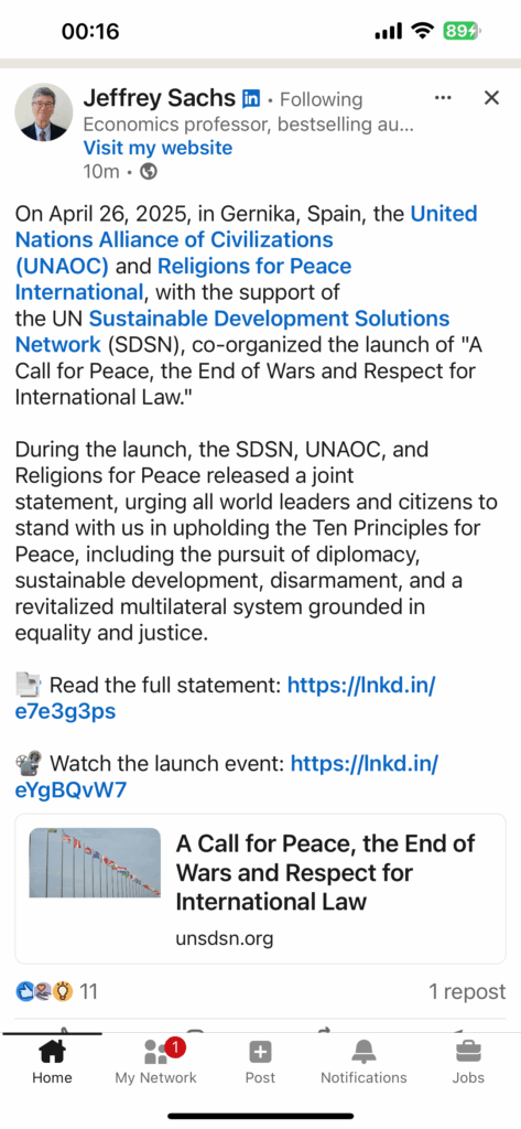 News about the Alliance for Peace was circulated on his social media handles by UNSDSN President Professor Jeffrey Sachs who will be delivering a keynote speech on the topic of “Achieving Sustainable Development in our Age of Instability” on May 2, 2025, at 7:00 PM (EEST), at Frederick University in Nicosia, Cyprus. The event will be livestreamed and accessible online: https://www.frederick.ac.cy/live/.