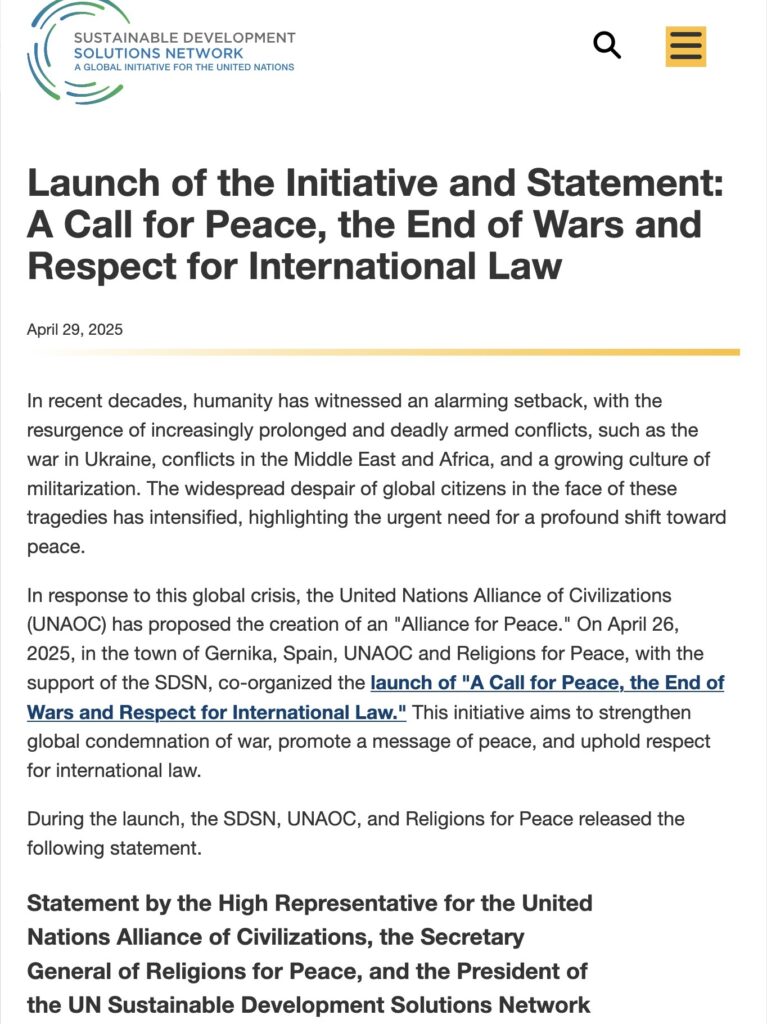 It was launched on April 29, 2025, in the town of Gernika, Spain, by the UNAOC and Religions for Peace, with the support of the UN Sustainable Development Solutions Network (SDSN). The statement announcing the launch laid out Ten Principles of Peace. In addition to comfort-zone points such as Pursuing Diplomacy and Unity in Diversity, the Ten Principles recommend walk-the-talk action such as: Support the Politics of Peace, Channel Cuts in Military Spending to a Fund for Sustainable Development, End the Use of Unilateral Coercive Measures (Sanctions) and Support the Prohibition of Nuclear Weapons.