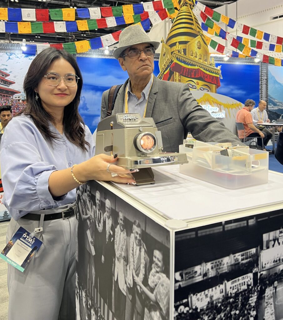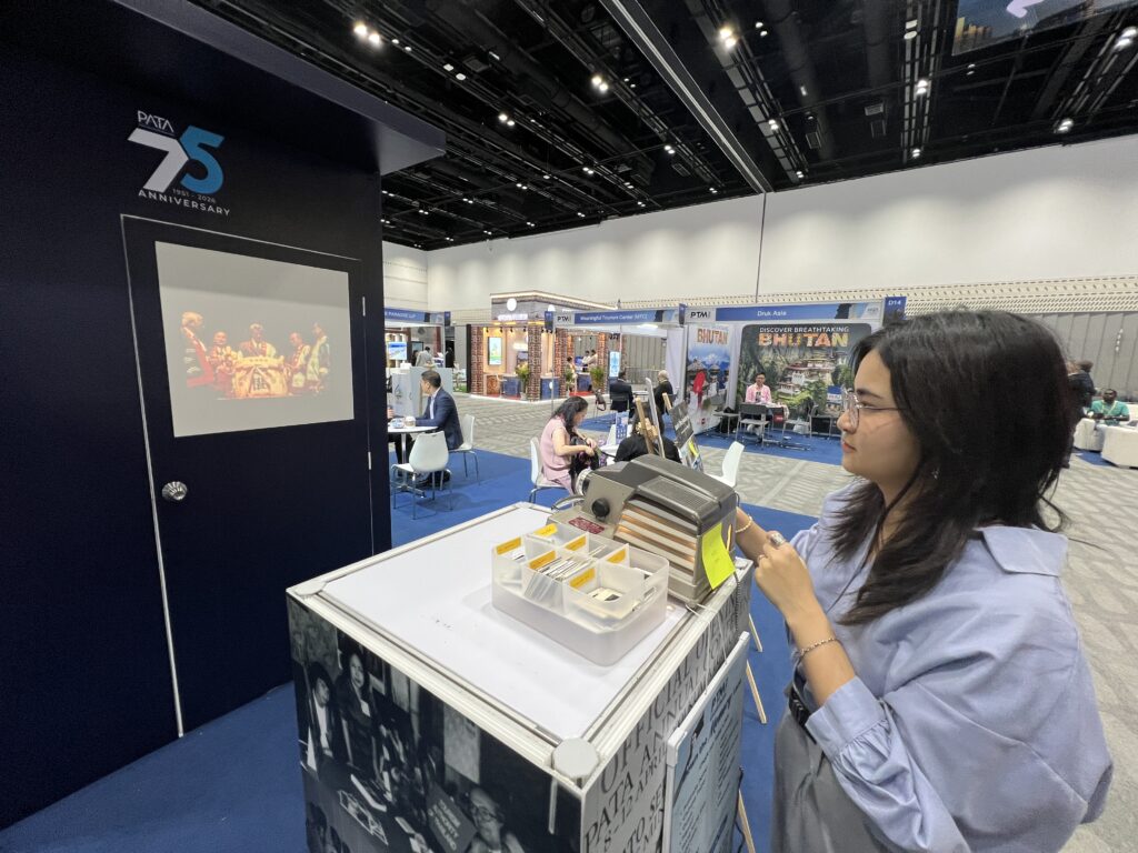 To attract further attention to the webpage and generate membership interest, the PATA Comms team set up special booth at the PTM 2025 (image below), where interested parties could see old slides from the PATA archives. The slides were being shown via a vintage projector which Alice found at Bangkok’s famous flea-market at Chatuchak Park and bought for 2,500 baht.