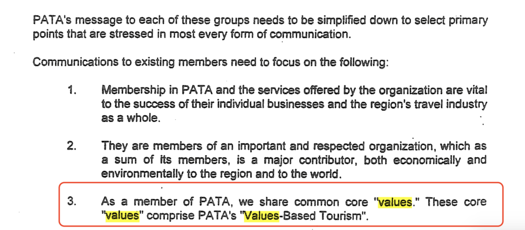 The “Values-based tourism” concept was presented as part of a PATA communications strategy at a Management Committee meeting in New Zealand in April 1995. The image below shows how it was described in that Management Committee report (which is in my own private archives):