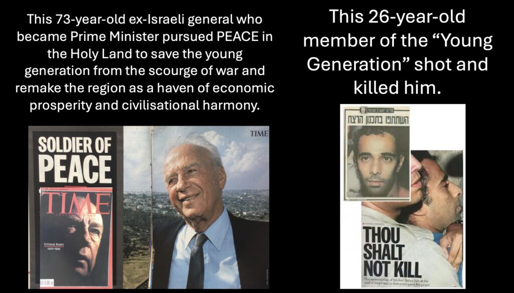 A mere 48 hours later, PM Rabin was assassinated — NOT by one of the usual gang of suspects, but ONE OF HIS OWN HOMEGROWN RELIGIOUS EXTREMISTS.