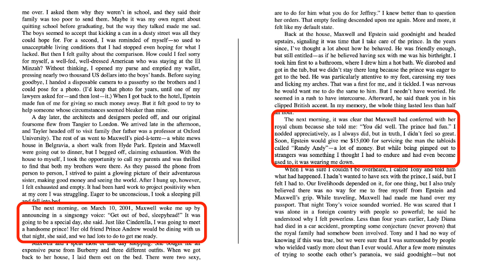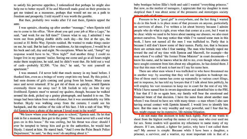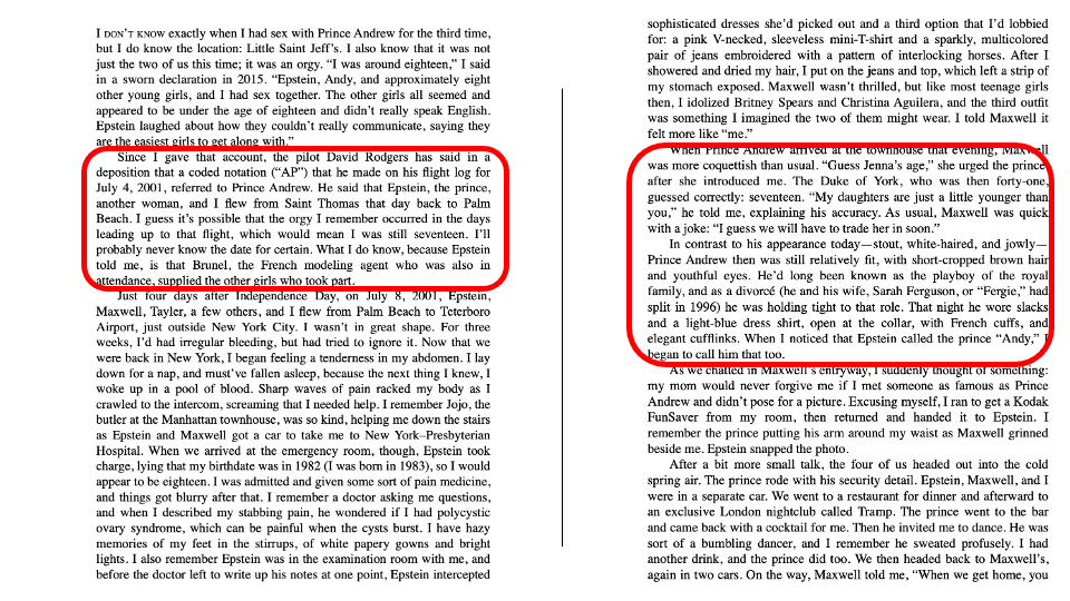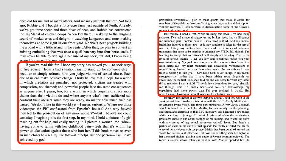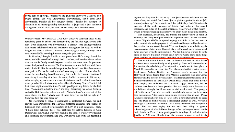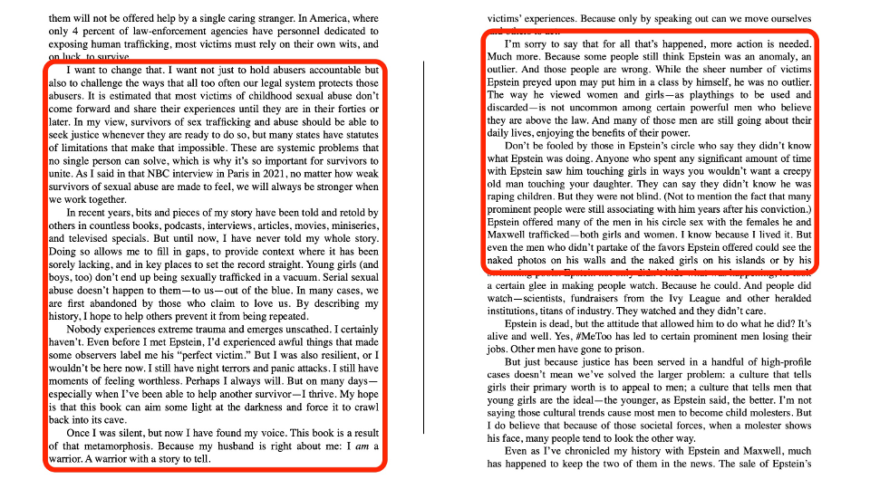 “She (Virginia Roberts Giuffre) wanted the world to know who she really was so that survivors of abuse who might read her words would feel less alone. She hoped that if she painted a real portrait of her suffering, it would inspire more people to fight to make the changes she believed were so desperately needed — prime among them, legislation to eliminate statute of limitations provisions for sexual abusers of children.”