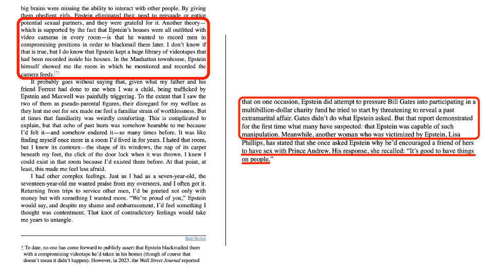 Below are screenshots of excerpts from the book. Both Ms Wallace and Ms Giuffre focussed on the sexual abuse, but many far broader questions arise. They deserve to be studied if justice is to prevail and the world avoid falling into the clutches of criminals and gangsters.