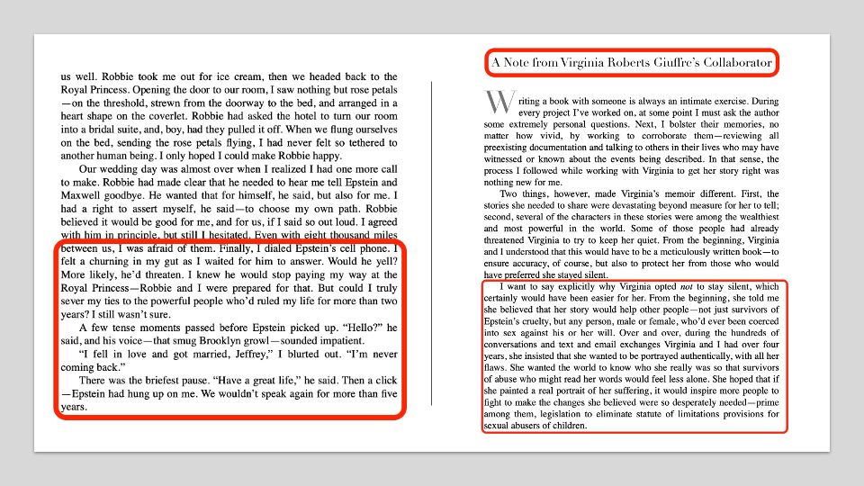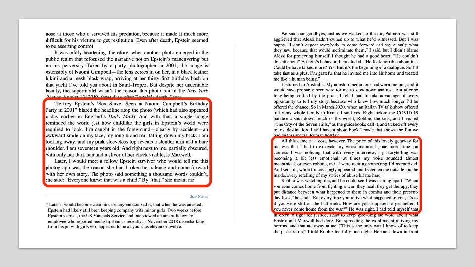 “We don’t live in this world yet — I mean, seriously: Where are those videotapes the FBI confiscated from Epstein’s houses? And why haven’t they led to the prosecution of any more abusers? — but I believe we could someday. Imagining it is the first step. In my mind, I hold a picture of a girl reaching out for help and easily finding it. I picture a woman, too, who — having come to terms with her childhood pain — feels that it’s within her power to take action against those who hurt her. If this book moves us even an inch closer to a reality like that — if it helps just one person — I will have achieved my goal.”