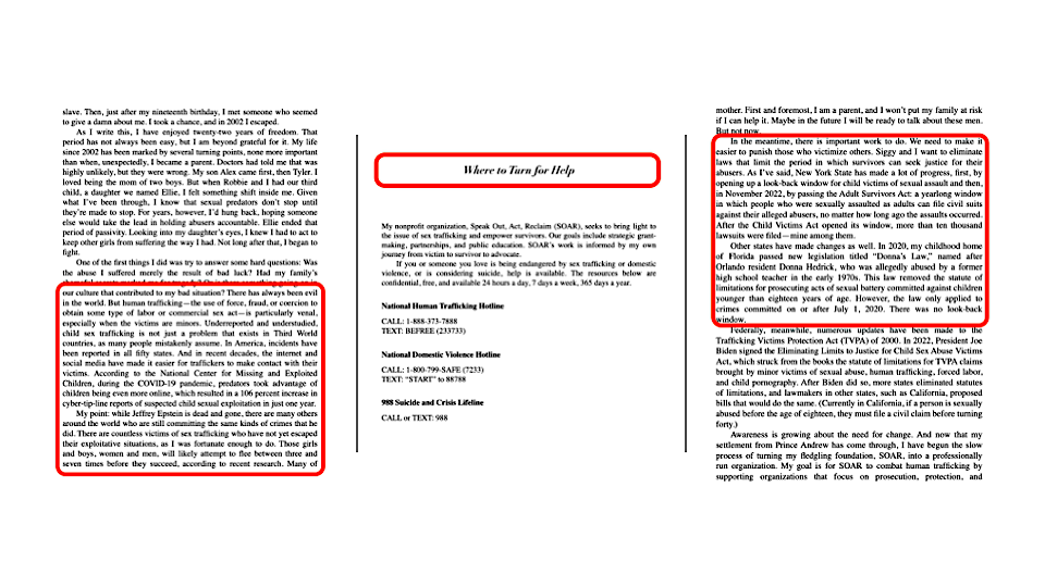 “Each one of us can make positive change. I truly believe that. I hope for a world in which predators are punished, not protected; victims are treated with compassion, not shamed; and powerful people face the same consequences as anyone else. I yearn, too, for a world in which perpetrators face more shame than their victims do and where anyone who’s been trafficked can confront their abusers when they are ready, no matter how much time has passed.
