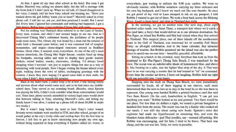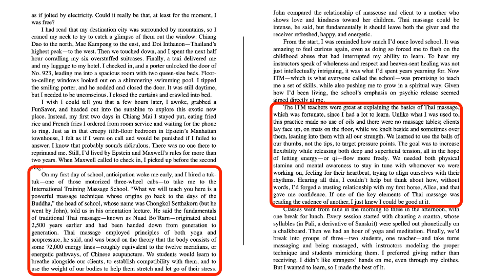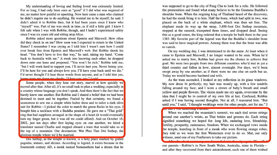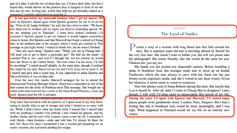 Yes, indeed, Thailand comes out very well in this best-selling book. She outlines in meticulous detail about how Epstein and his devilish co-conspirator Ghislaine Maxwell sent her to Chiang Mai to get trained in Thai massage and recruit an unnamed Thai girl to join his evil empire. Instead, she met a warm, sensitive Australian at a Muay Thai camp, got married in a traditional Buddhist ceremony at the famous Wat Doi Suthep and severed relations with Epstein with one phone call.
