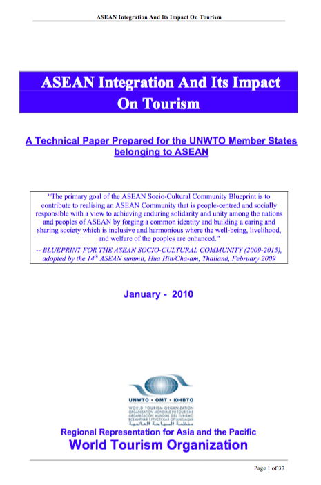 (+) ASEAN Integration And Its Impact On Tourism (2010): Commissioned by the UN World Tourism Organisation, this technical paper was prepared for distribution to the UNWTO Member States belonging to ASEAN. It highlighted the importance of socio-cultural integration amongst the ASEAN countries as a major contributor to travel & tourism and recommended a number of ways to fulfill this critical long-term policy objective of the 10-member grouping.